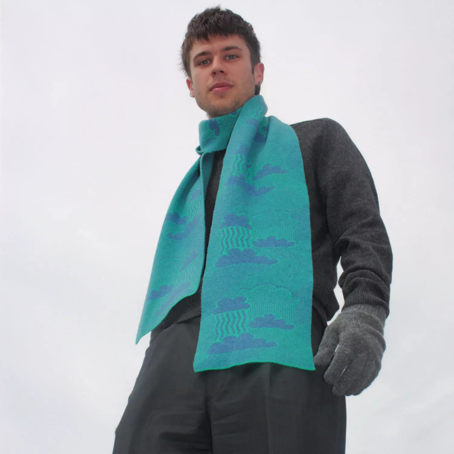 Made in Britain and inspired by the British weather, this fine knit jacquard scarf features patterns of clouds, rain and sunbeams. This product has been crafted in 100% lambswool from non-mulesed sources only, naturally sustainable, renewable and biodegradable.