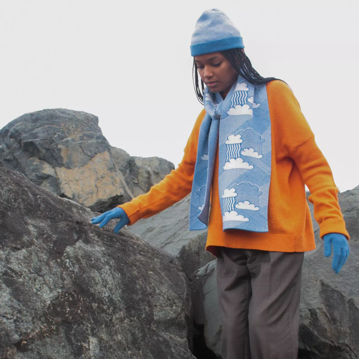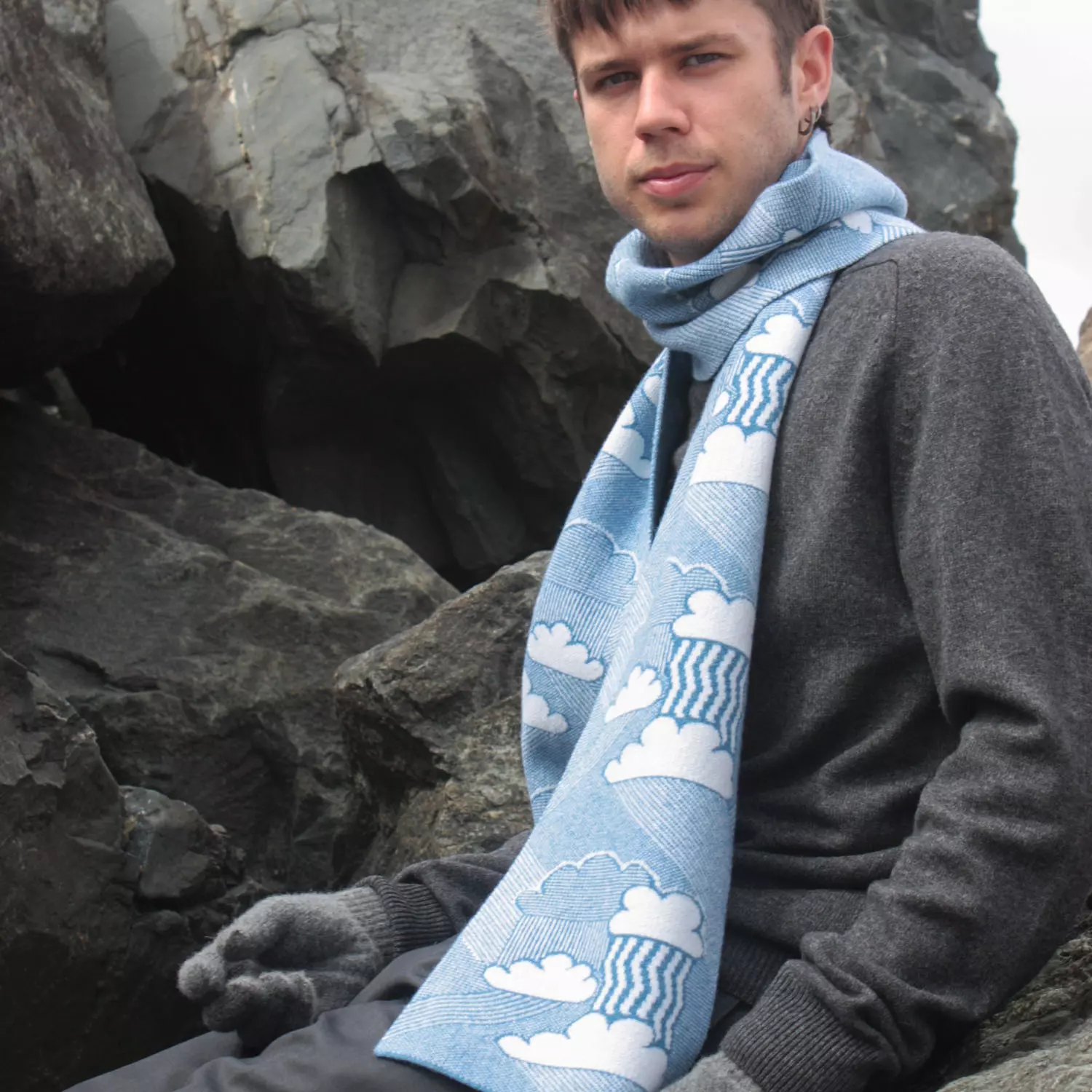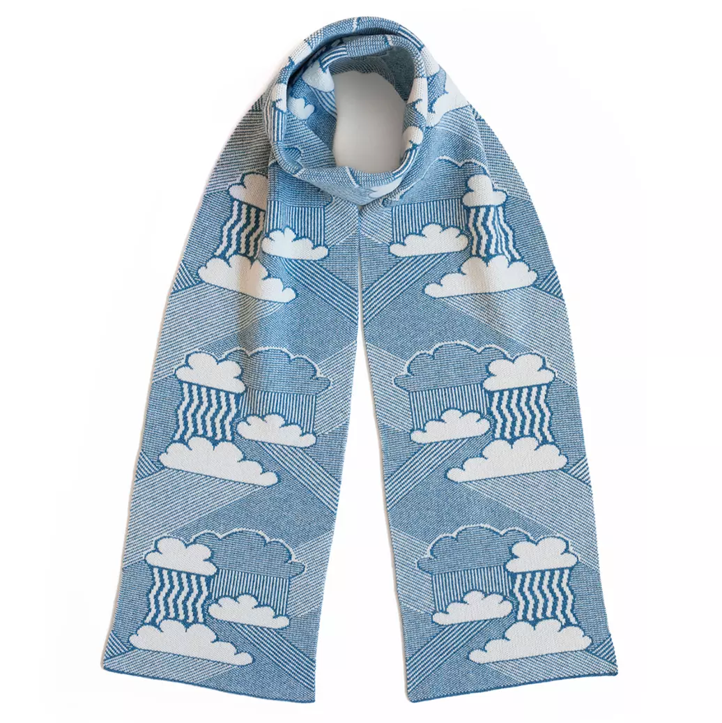 Made in Britain and inspired by the British weather, this fine knit jacquard scarf features patterns of clouds, rain and sunbeams. This product has been crafted in 100% lambswool from non-mulesed sources only, naturally sustainable, renewable and biodegradable.