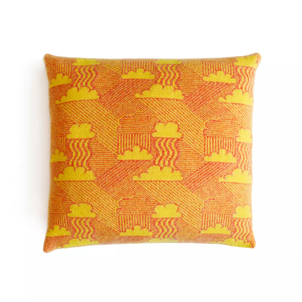 The Acid Drop Cushion is an explosion of colour featuring tangerine orange and lemon yellow knit clouds and sunbeams. Each cushion is handmade in our Brighton studio from ethical, non-mulesed lambswool spun in Scotland and filled with a plump ethical duck feather pad.