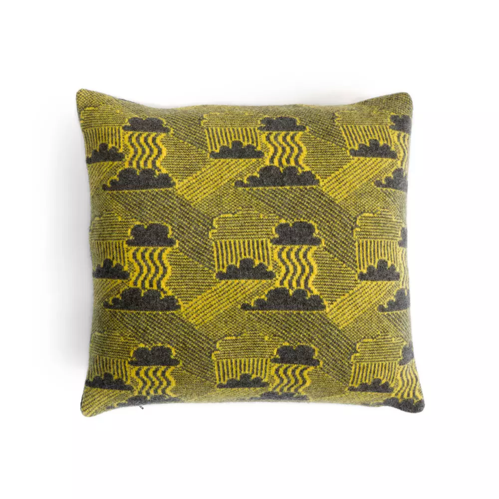A yellow and soft grey cushion featuring beautifully knitted imagery of clouds, rain and sunbeams. Each cushion is handmade in our Brighton studio from non-mulesed Scottish spun lambswool and filled with a duck feather pad.