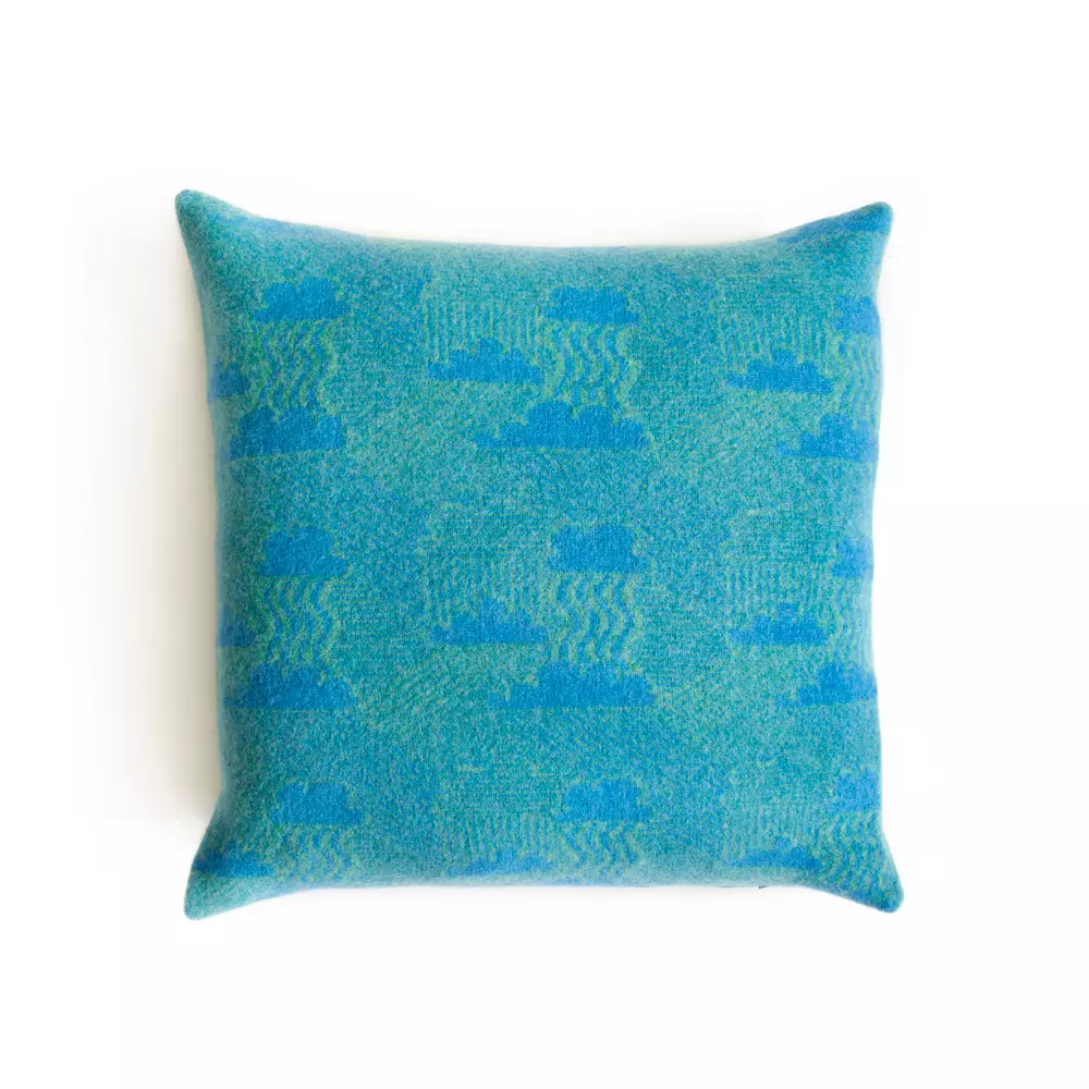 The Cloud Nine Cushion is knitted in a subtle blue and mint green colour way, featuring a pattern of clouds, rain and sunbeams. Each cushion is handmade in our Brighton studio from ethical, non-mulesed lambswool spun in Scotland and filled with a soft plump ethical duck feather pad.