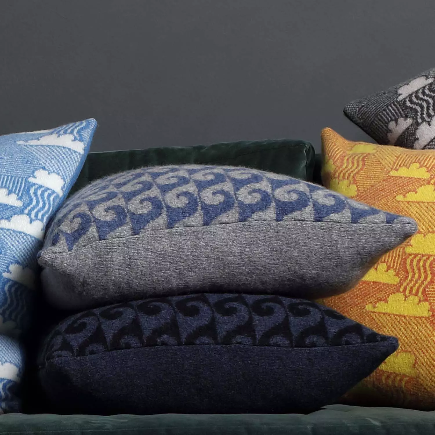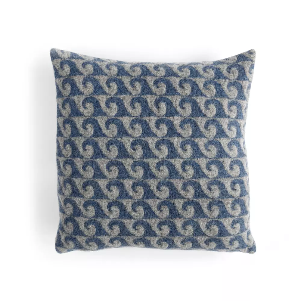 The Thames Wave cushion is inspired by the UK Maritime shipping forecast and handmade in our Brighton studio from soft lambswool in silver and blue hues.